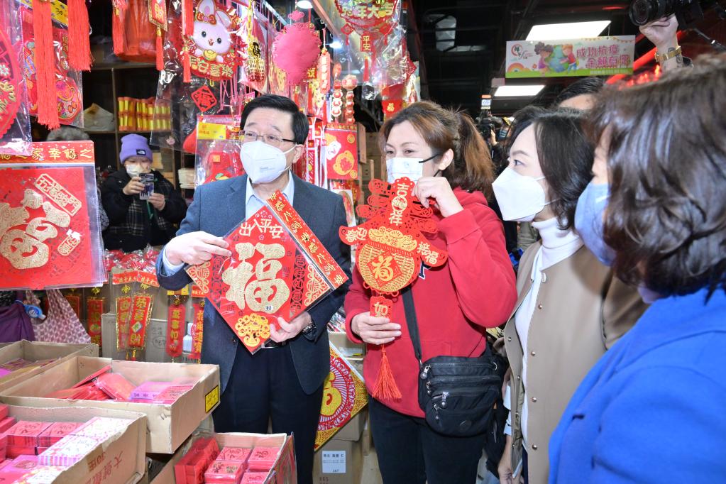 1月20日,香港特區行政長(cháng)官李家超和特區政府民政及青年事務(wù)局局長(cháng)麥美娟、民政事務(wù)總署署長(cháng)張趙凱渝與商販傾談,了解經(jīng)營(yíng)情況。新華社發(fā)(香港特區政府新聞處供圖)