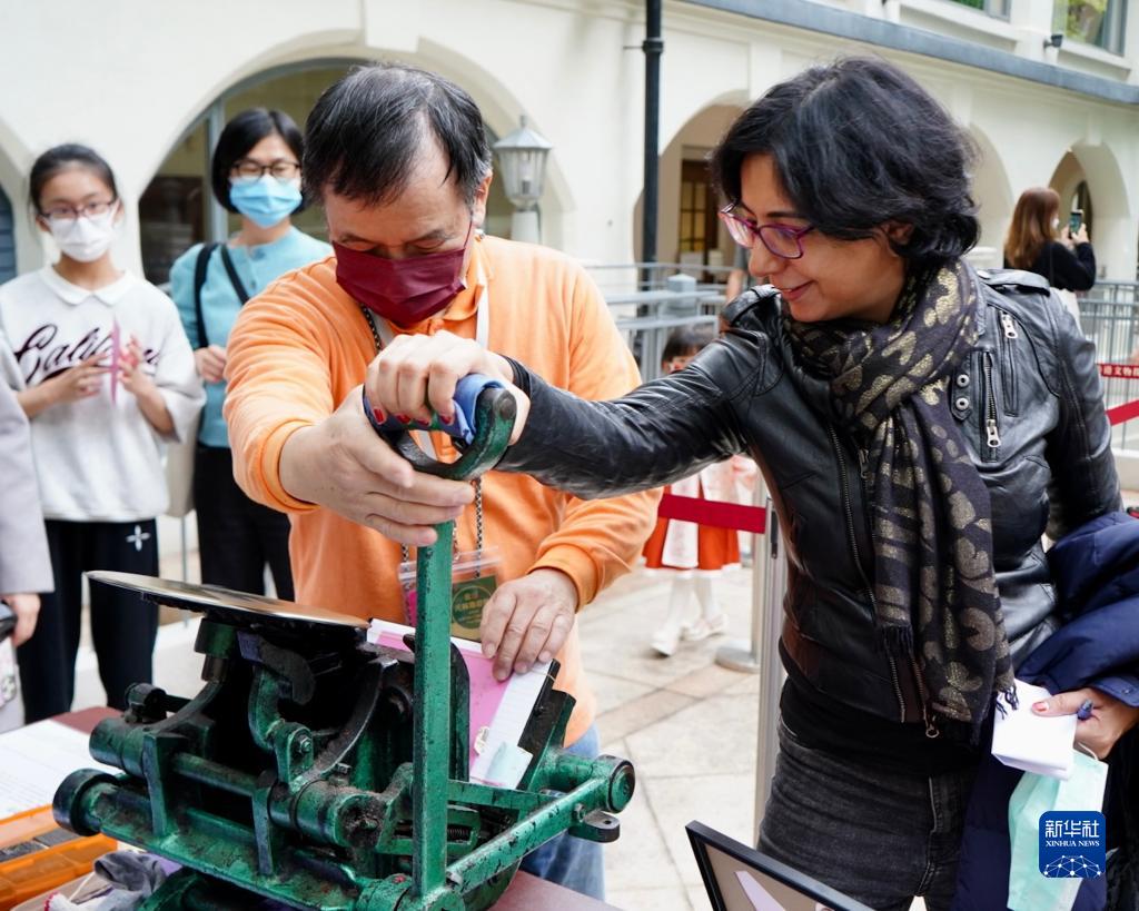 2月5日,在香港文物探知館舉行的“金沙元宵游園會(huì )”中,參觀(guān)者在體驗用活版印刷制作文物圖案的紀念頁(yè)。新華社記者 褚萌萌 攝