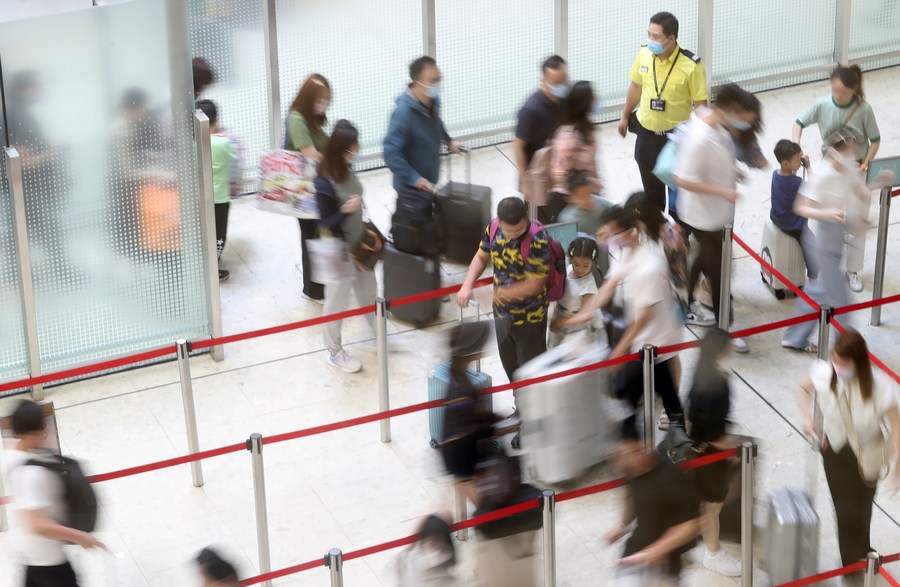 5月3日,旅客經(jīng)香港西九龍高鐵站前往內地。新華社記者 李鋼 攝
