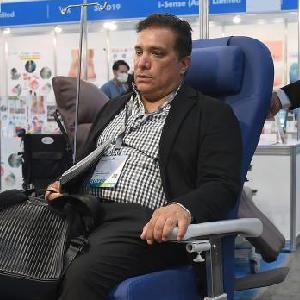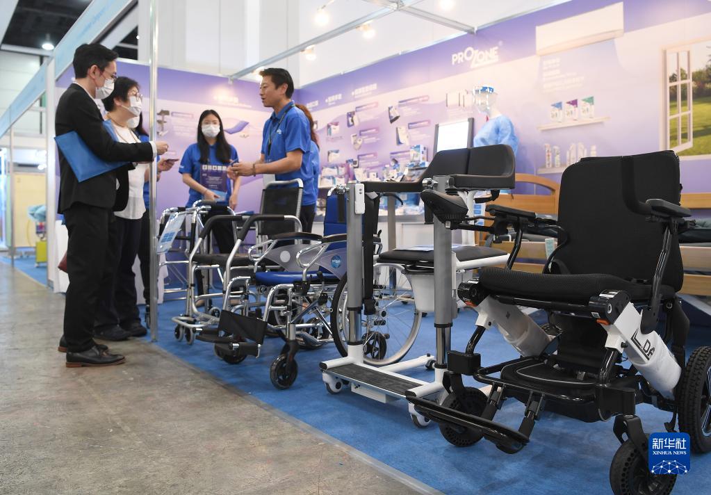5月16日,參展商在第十四屆“香港國際醫療及保健展”上介紹輪椅和升降轉移椅。新華社記者 陳鐸 攝