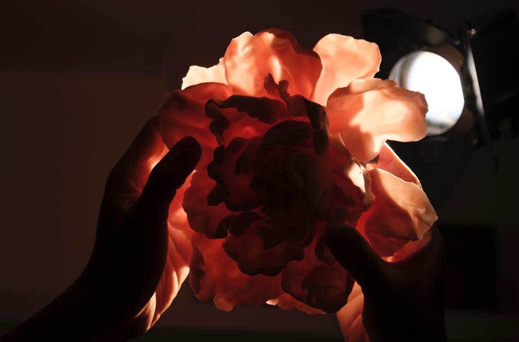 香港陶藝家王俊賢制作的陶瓷牡丹花薄似蟬翼(7月30日攝)。新華社記者 王申 攝