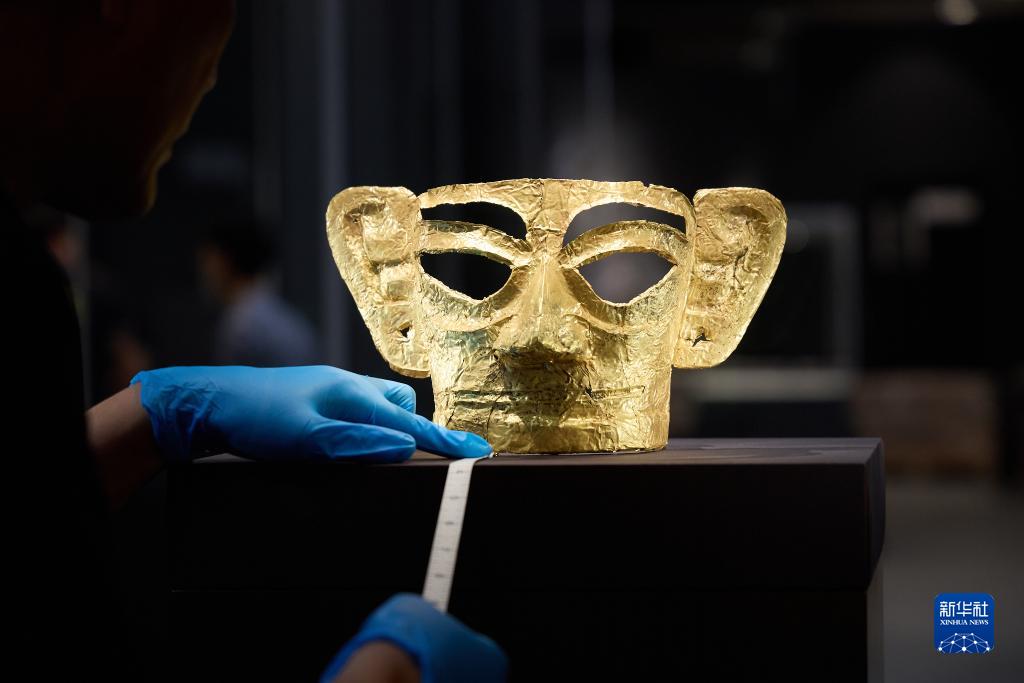 9月18日,布展團隊工作人員擺放文物“金面罩”。新華社發(fā)(香港故宮文化博物館供圖)