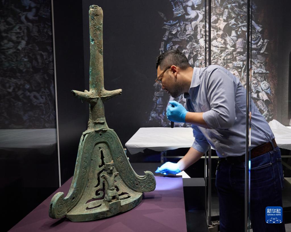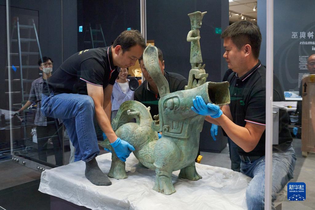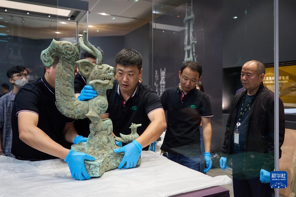 9月18日,布展團隊工作人員擺放文物“青銅二號神樹(shù)底座”。新華社發(fā)(香港故宮文化博物館供圖)