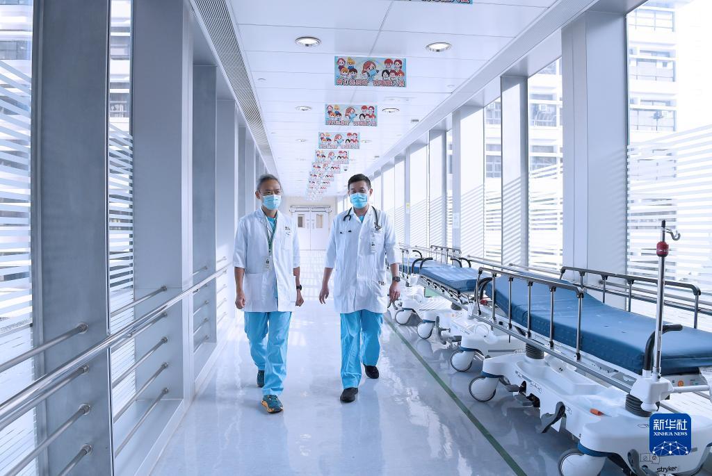 10月12日,匡煜坤(右)與楊耀昌從瑪嘉烈醫院的走廊走過(guò)。新華社記者 陳鐸 攝