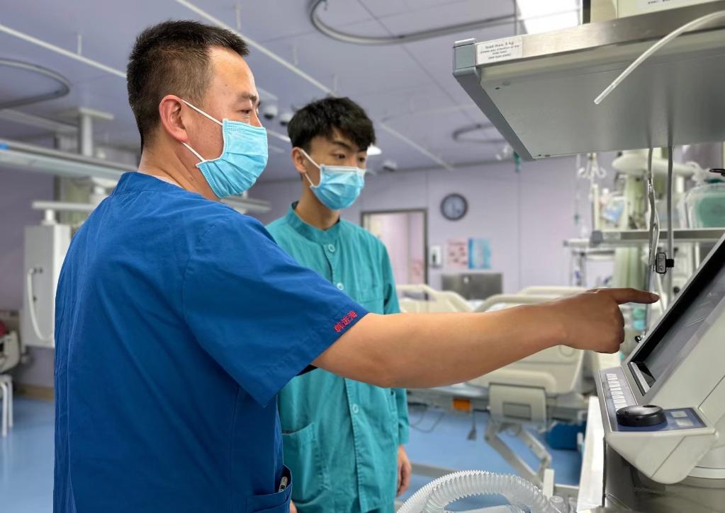 5月10日,韓進(jìn)海(左)在教護士調節設備參數。新華社記者 李寧 攝