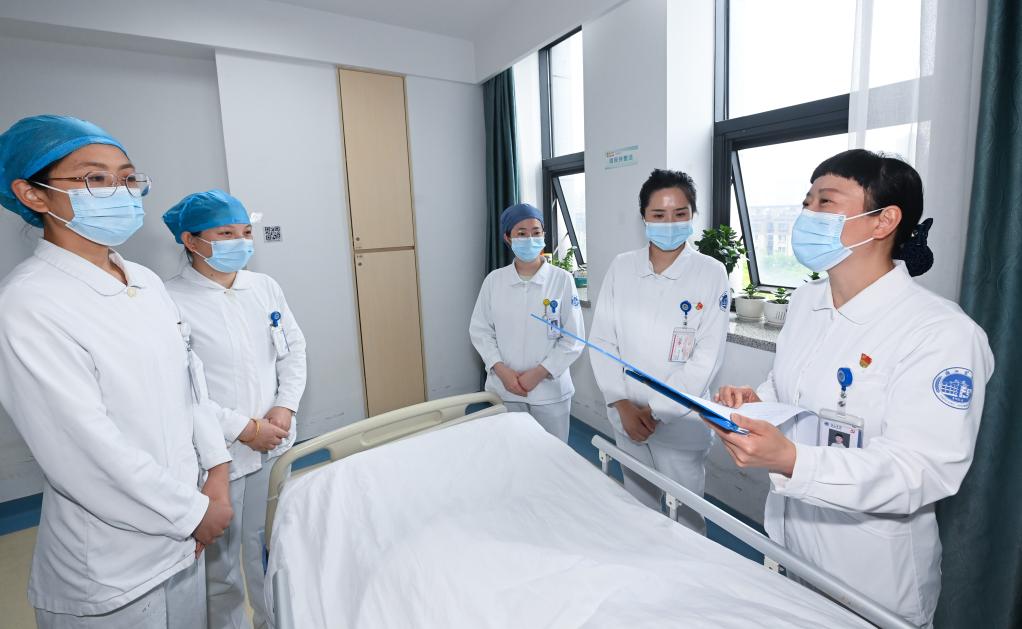 5月11日,浙江醫院醫療照護病房護士長(cháng)項巧珍(右一)與安寧療護護士團隊交流工作。新華社記者 徐昱 攝