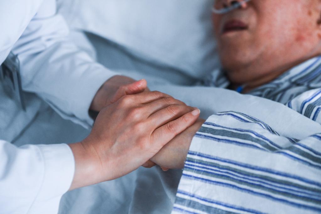 5月11日,浙江醫院安寧療護護士握著(zhù)病人的手。新華社記者 徐昱 攝