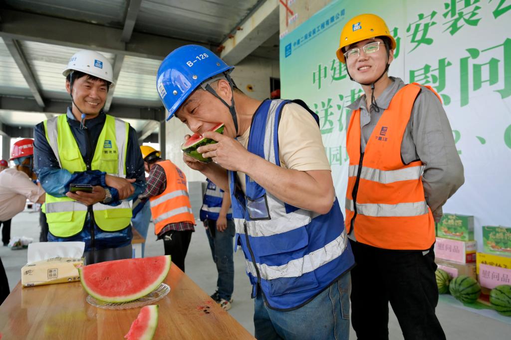 6月16日,在北京市經(jīng)開(kāi)區的中建二局安裝公司信創(chuàng )園項目舉辦的夏送清涼慰問(wèn)活動(dòng)上,建筑工人在吃西瓜。新華社記者 才揚 攝