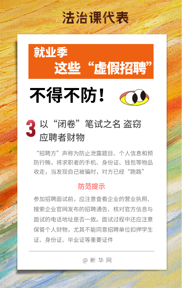 近日,人力資源和社會(huì )保障部會(huì )同國家市場(chǎng)監督管理總局發(fā)布通知,部署開(kāi)展為期兩個(gè)月的清理整頓人力資源市場(chǎng)秩序專(zhuān)項行動(dòng),通知明確要以打擊虛假招聘等為重點(diǎn)。以下為幾種常見(jiàn)的“虛假招聘”套路,大家一定要注意防范!
