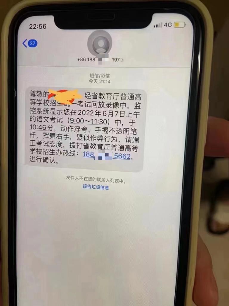 “尊敬的考生×××,經(jīng)省教育廳普通高等學(xué)校招生統一考試回放錄像中,監控系統顯示您在2022年6月7日上午的語(yǔ)文考試(9:00—11:30)中,于10時(shí)46分,動(dòng)作浮夸,手握不透明筆桿,揮舞右手,疑似作弊行為,請端正考試態(tài)度,撥打省教育廳普通高等學(xué)校招生辦熱線(xiàn):188×××進(jìn)行確認?!苯?,有考生向廈門(mén)警方反映,自己接到了聲稱(chēng)是“省教育廳普通高等學(xué)校招生辦”的通知短信,懷疑是詐騙信息。該短信在開(kāi)頭準確寫(xiě)明了考生姓名,并在結尾要求考生主動(dòng)撥電話(huà)號碼進(jìn)行確認。經(jīng)與教育部門(mén)核實(shí)確認,高考作弊違規行為不會(huì )以短信、電話(huà)、鏈接等方式通知。廈門(mén)警方提醒,不法分子通過(guò)非正常渠道搜集到考生信息,并向考生發(fā)送所謂“疑似作弊”的通知短信,考生一旦回撥電話(huà),就可能被不法分子以“處理作弊行為”為由實(shí)施詐騙。