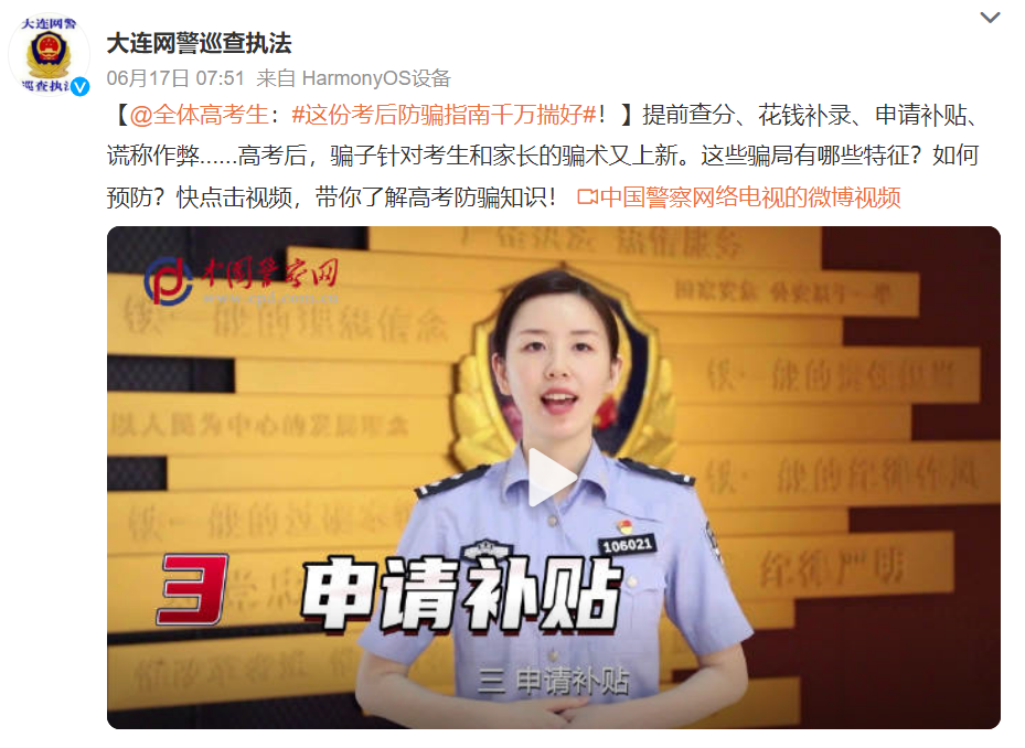 警方提醒廣大考生及考生家長(cháng),不管詐騙手段如何演變,萬(wàn)變不離其宗的“核心需求”就是“要錢(qián)”,因此在收到此類(lèi)短信或電話(huà)時(shí),應第一時(shí)間與學(xué)校、教育部門(mén)核實(shí),在無(wú)法確認信息真實(shí)性的情況下,可撥打96110咨詢(xún)或舉報。此外,不要抱有僥幸心理,任何打著(zhù)有“內部名額”或“內部渠道”的旗號要求繳納費用的通知均為詐騙。