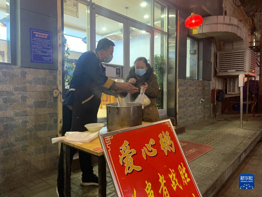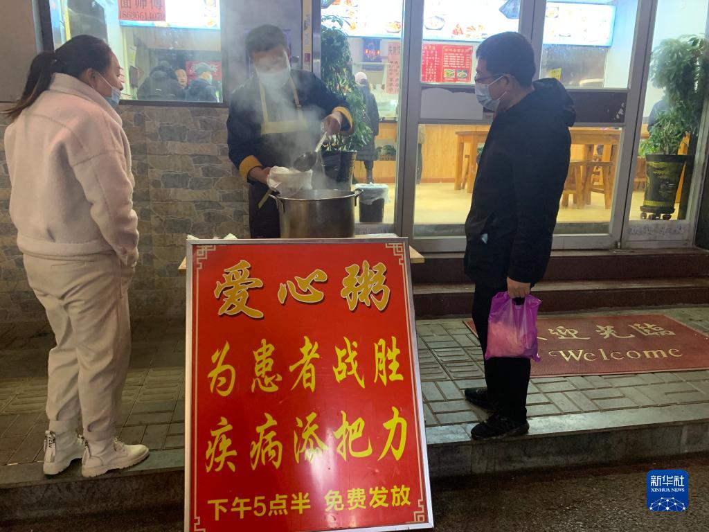 顧客在大強家常菜館外領(lǐng)取愛(ài)心粥(1月7日攝)。新華社記者 魏飚 攝