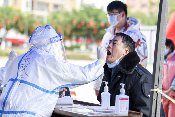 2月9日,在廣西德??h,工作人員為群眾進(jìn)行核酸采樣。新華社記者 曹祎銘 攝