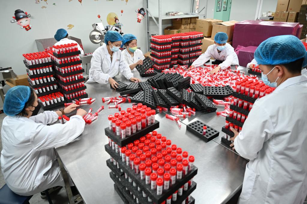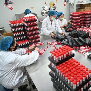 3月16日,位于廈門(mén)生物醫藥產(chǎn)業(yè)園的美林美邦(廈門(mén))生物科技有限公司的員工在包裝滅活型一次性病毒采樣管。 新華社記者 林善傳 攝