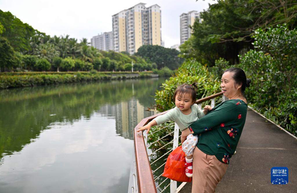 住在美舍河邊的居民張淑彩帶著(zhù)孫女在河邊棧道上游玩(3月19日攝)。新華社記者 郭程 攝