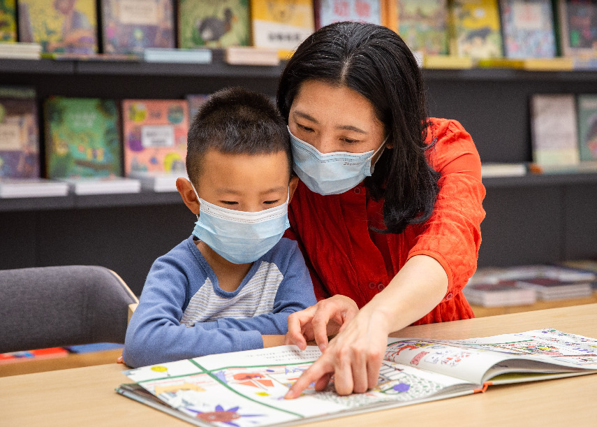 4月22日,家長(cháng)帶著(zhù)孩子在南京一家書(shū)城內閱讀。新華社發(fā)(蘇陽(yáng)攝)