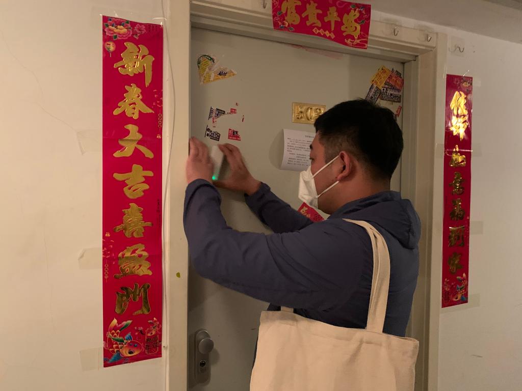 趙鵬為居家隔離居民安裝門(mén)磁。(受訪(fǎng)者供圖)