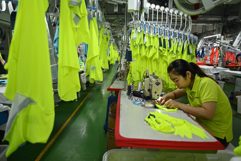 5月13日,在福建省晉江市卡爾美運動(dòng)服裝生產(chǎn)車(chē)間,工人在趕訂單。新華社記者 周義 攝