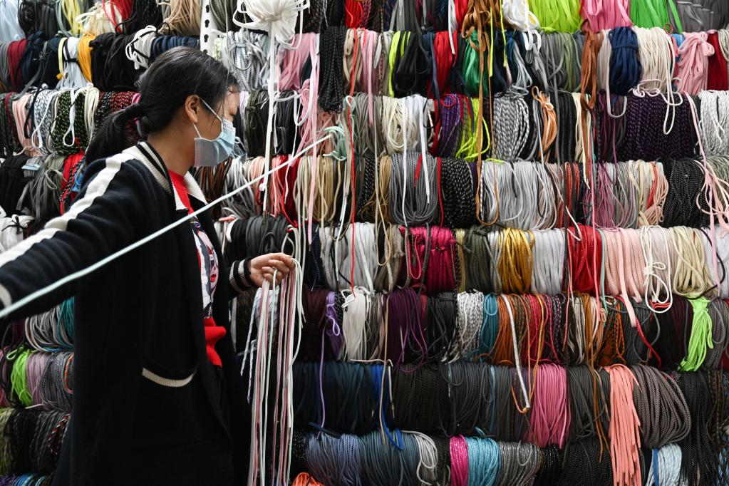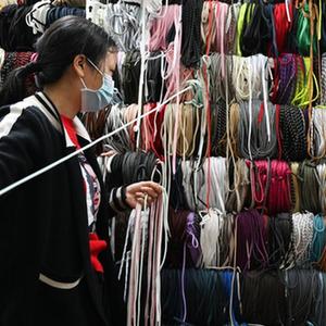 5月16日,在福建省晉江國際鞋紡城,一家鞋帶織造企業(yè)的銷(xiāo)售人員在挑選鞋帶。新華社記者 周義 攝