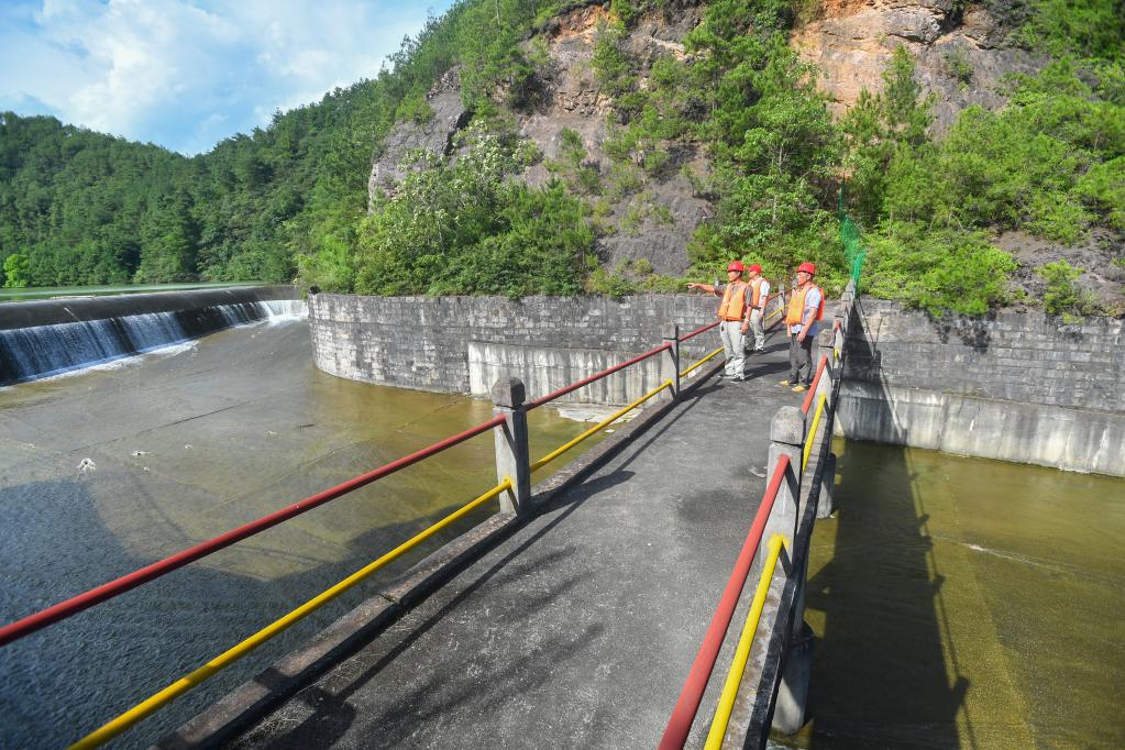 6月24日,在湖南省永州市道縣廊洞水庫,工作人員巡查大壩情況。新華社記者 陳澤國 攝