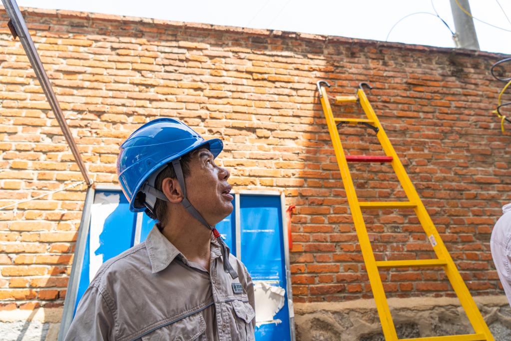 一個(gè)多小時(shí)后,孔祥雨接好最后一根電線(xiàn),隨后爬下電線(xiàn)桿,此時(shí)室外溫度達到39攝氏度,他已經(jīng)渾身濕透。