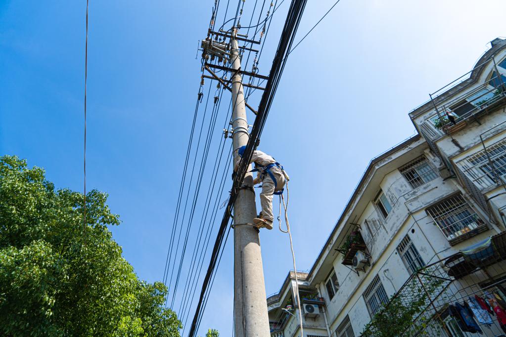 新華社合肥7月15日電(記者趙金正、劉方強)13日上午10時(shí),烈日炎炎,熱浪翻滾,安徽省合肥市廬陽(yáng)區的室外氣溫已經(jīng)達到了35攝氏度。身穿純棉長(cháng)袖制服的電力工人孔祥雨系上安全繩,戴好絕緣手套,穿上登桿腳扣,頂著(zhù)烈日,爬上被曬得滾燙的電線(xiàn)桿,在離地10米的空中進(jìn)行電路改造維護。