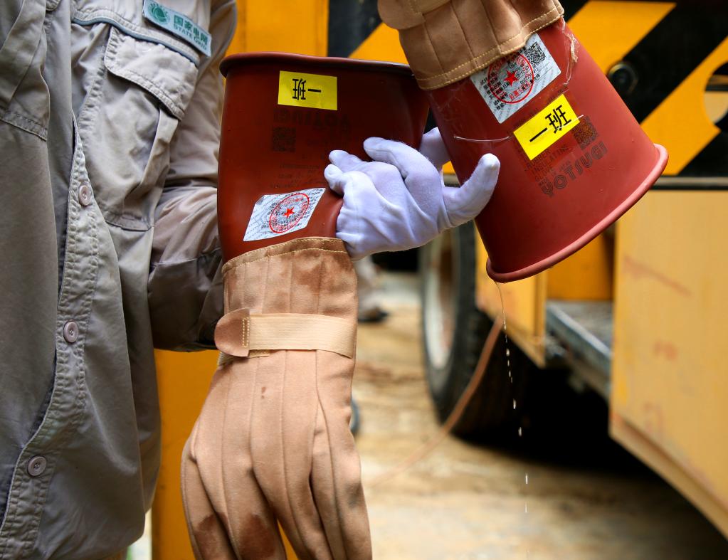 電力工人將絕緣手套里的汗水倒出。(圖片由受訪(fǎng)者提供)