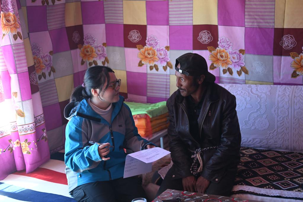 在唐古拉山鎮,汪鈺婷在牧民家中進(jìn)校訪(fǎng)談。新華社記者 張龍攝