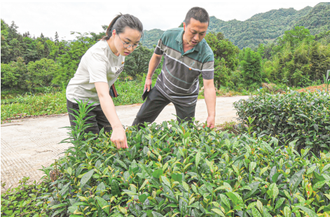 二〇二一年夏,剛參加駐村工作的杜富佳(左)在沙塘村了解茶產(chǎn)業(yè)發(fā)展情況。受訪(fǎng)者供圖