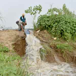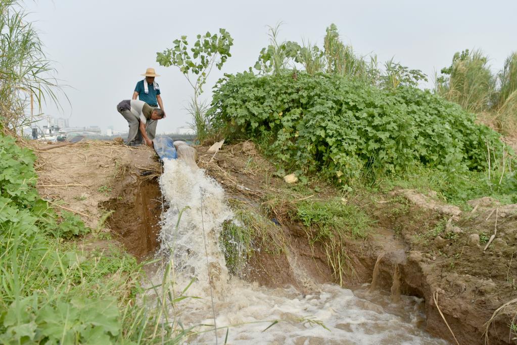 23日下午,在老洲鄉老洲泵站外江口,站長(cháng)潘和平正帶領(lǐng)工人將水泵取水口下移到江水中,確保水泵能夠順利抽提江水。這里抽提的江水將通過(guò)老洲泵站提水到主干渠,經(jīng)過(guò)長(cháng)江一級提水、圩內二級提水、支干渠三級提水,最終被送到田間地頭。