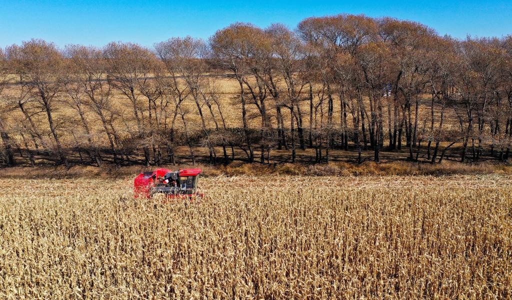 10月18日,這是通遼市奈曼旗新鎮正在收獲的玉米地。(無(wú)人機照片 新華社記者 連振 攝)