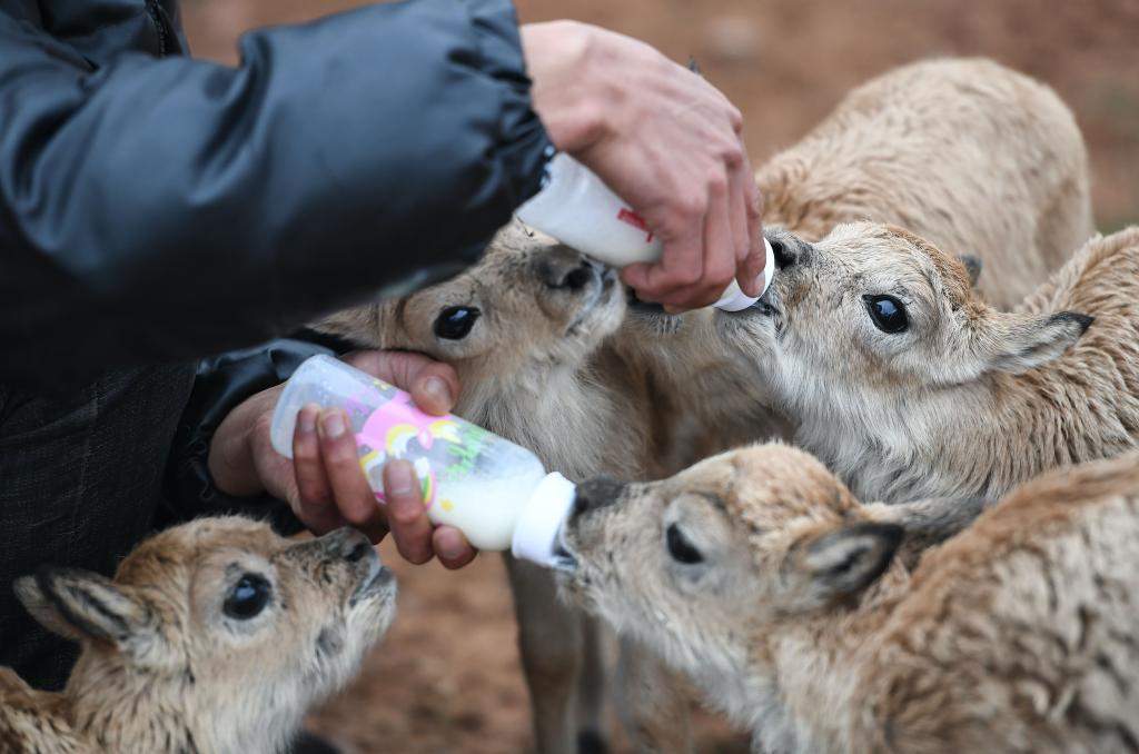 2020年7月7日,三江源國家公園管理局長(cháng)江源園區可可西里管理處卓乃湖保護站的工作人員在給藏羚羊幼仔喂奶。(新華社記者 薛玉斌 攝)