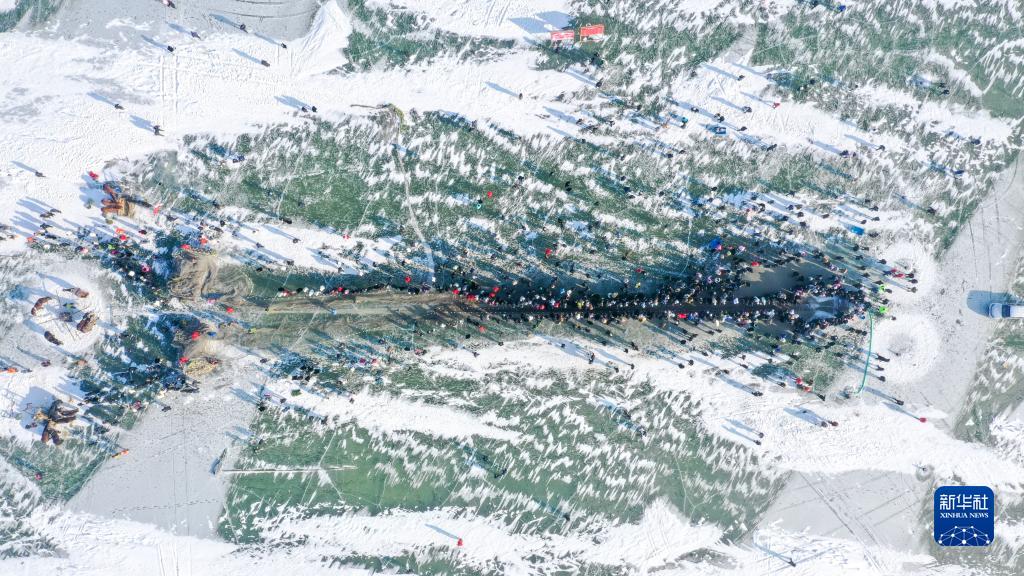 12月28日,在查干湖第二十一屆冬捕節現場(chǎng),游客觀(guān)看祭湖醒網(wǎng)儀式(無(wú)人機照片)。新華社記者 張楠 攝