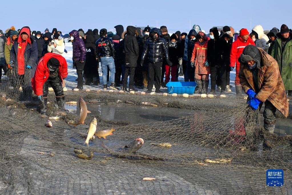捕魚(yú)現場(chǎng)十分熱鬧。馬拉著(zhù)絞盤(pán)一圈圈轉動(dòng),大大小小的魚(yú)逐漸被拉出冰面,遇見(jiàn)個(gè)頭特別大的,周邊游客就會(huì )發(fā)出歡呼?!拔业谝淮蝸?lái)東北,雖然天冷,但這樣震撼的捕魚(yú)現場(chǎng)真是不虛此行,我準備多買(mǎi)幾條魚(yú)送給親戚朋友?!眮?lái)自上海的孫邵敏告訴記者。