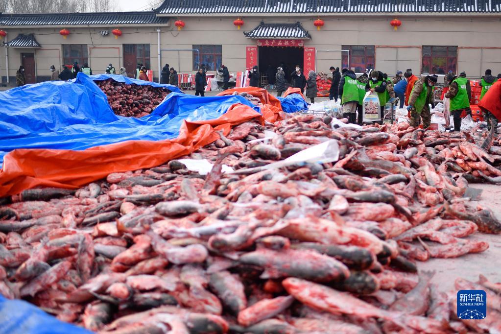 12月27日,查干湖魚(yú)產(chǎn)品超市的工作人員將各種魚(yú)類(lèi)打包裝箱。新華社記者 許暢 攝
