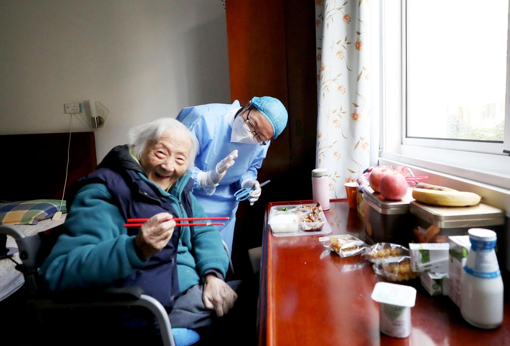 1月7日,在上海中福會(huì )養老院,一名老人在工作人員幫助下吃飯。新華社記者 方喆 攝
