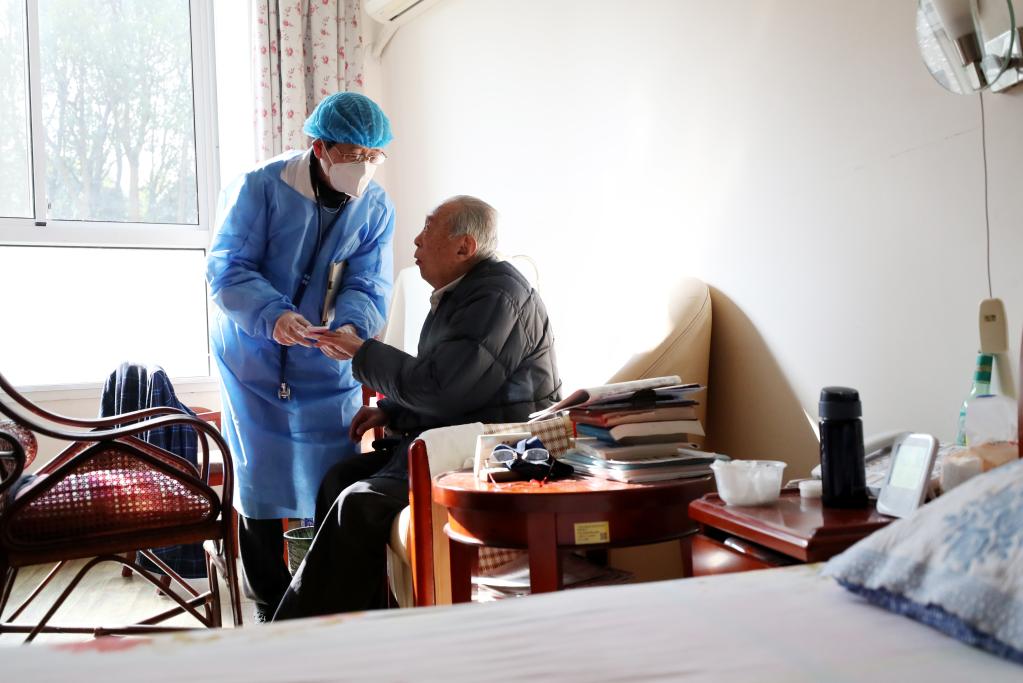 1月7日,在上海中福會(huì )養老院,駐院醫生彭?。ㄗ螅┙o老人做血氧監測。新華社記者 方喆 攝