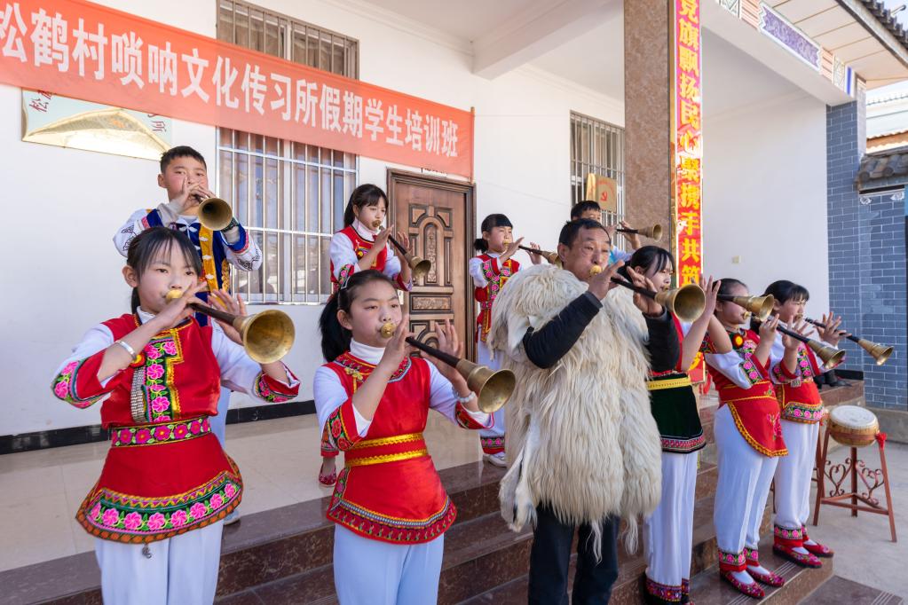 洱源縣松鶴村是遠近聞名的“嗩吶村”,村里嗩吶師傅眾多,現有嗩吶藝人150多人。為了更好地傳承和保護民族嗩吶文化,2013年村里建立了嗩吶文化傳習所,由嗩吶師傅利用周末和假期對孩子們進(jìn)行嗩吶演奏技藝培訓,目前學(xué)員已發(fā)展到40多名。