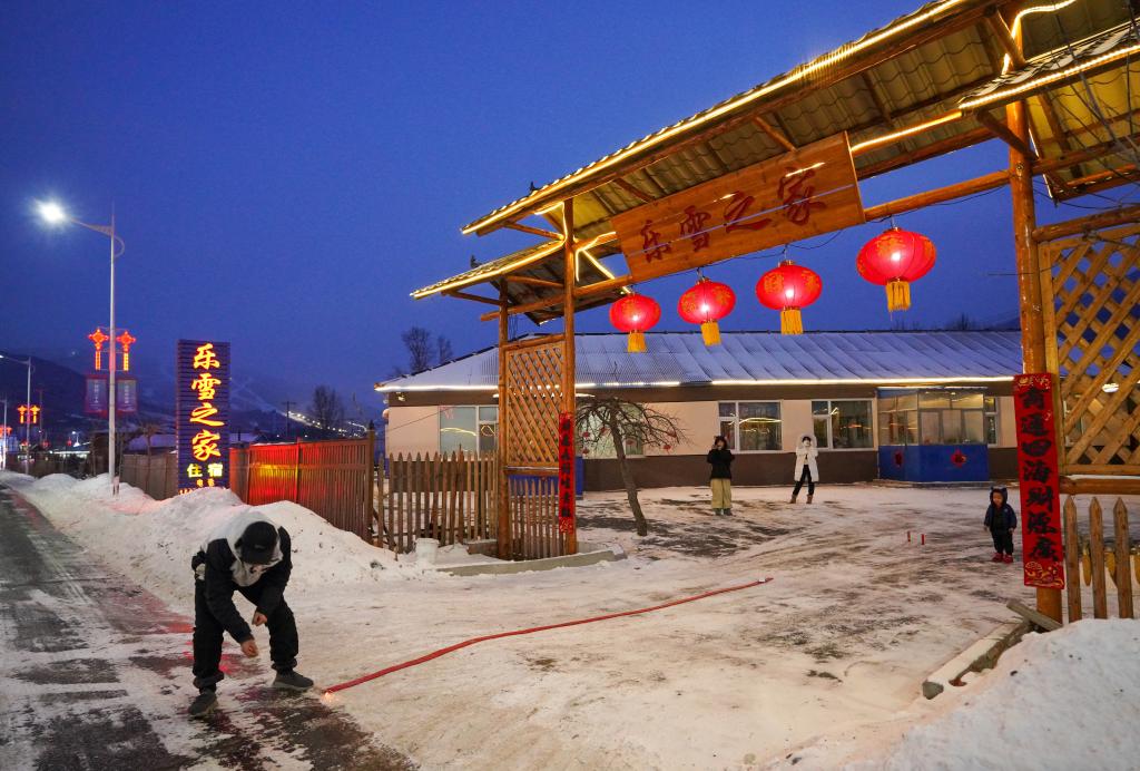 1月21日,南溝村村民邵鋒在自家經(jīng)營(yíng)的樂(lè )雪之家民宿門(mén)口與雪友一起放鞭炮。 新華社記者顏麟蘊 攝
