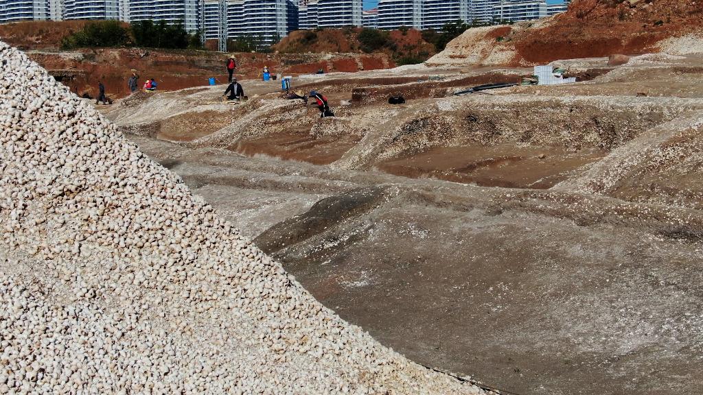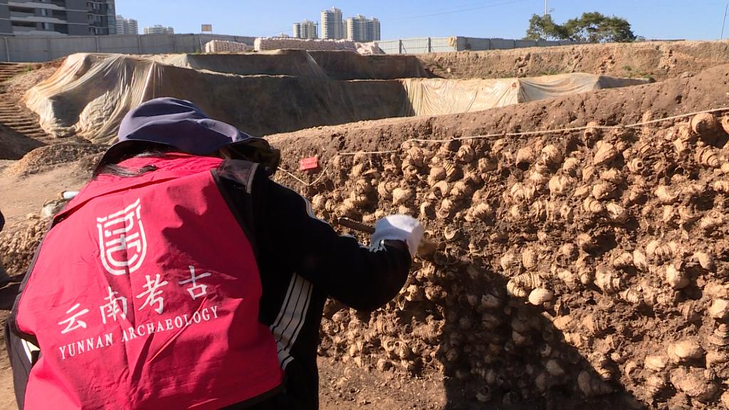 古城村遺址考古領(lǐng)隊、云南省文物考古研究所副研究館員周然朝介紹,古城村遺址是一處商周時(shí)期的大型湖濱貝丘遺址,面積約4.2萬(wàn)平方米,現存的貝丘堆積最厚處達6.5米,由大量尾部被敲破的螺螄殼與灰土層交替堆疊形成。