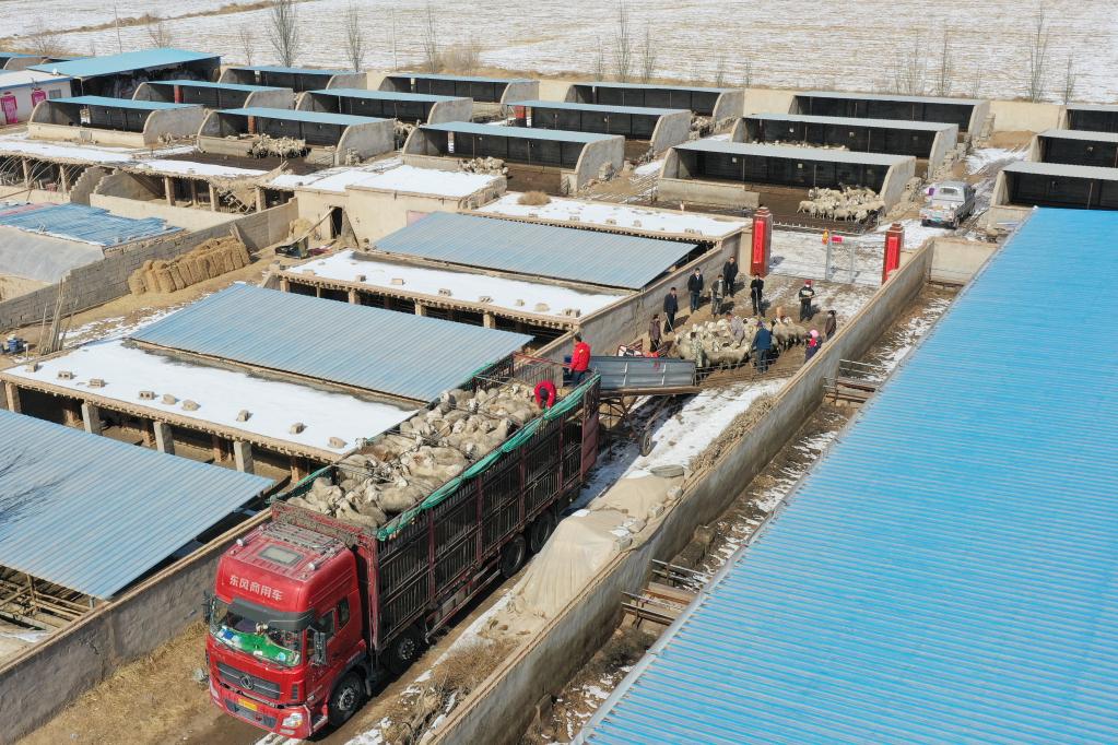 這是2月15日在甘肅省武威市古浪縣黃花灘鎮黃花灘村,村民將出售的肉羊趕出養殖圈舍。新華社記者 范培珅 攝