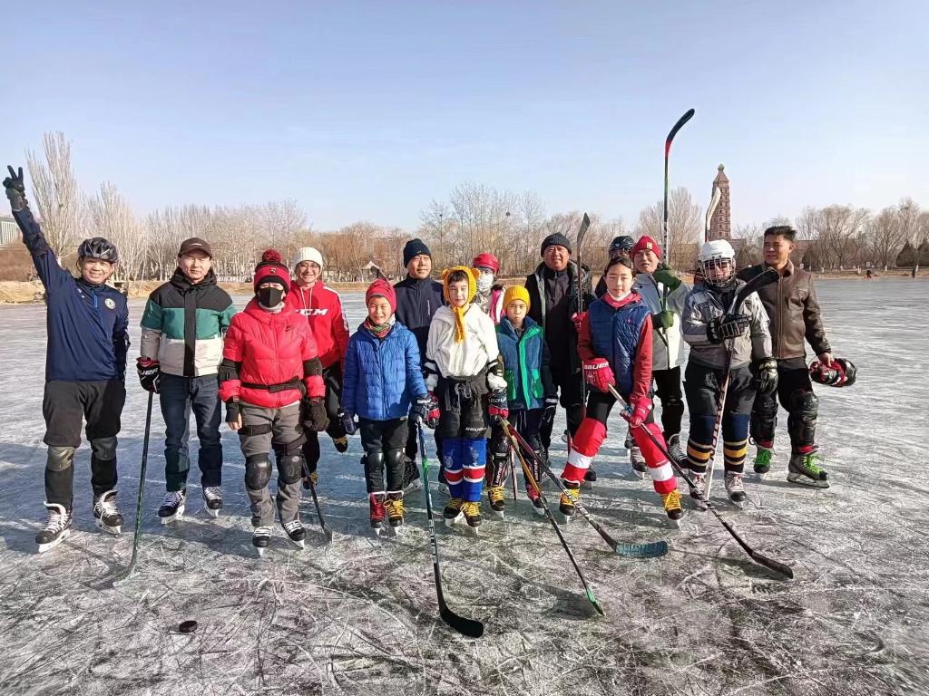 銀川市“火鳳凰”冰球隊在冰面合影。受訪(fǎng)者供圖