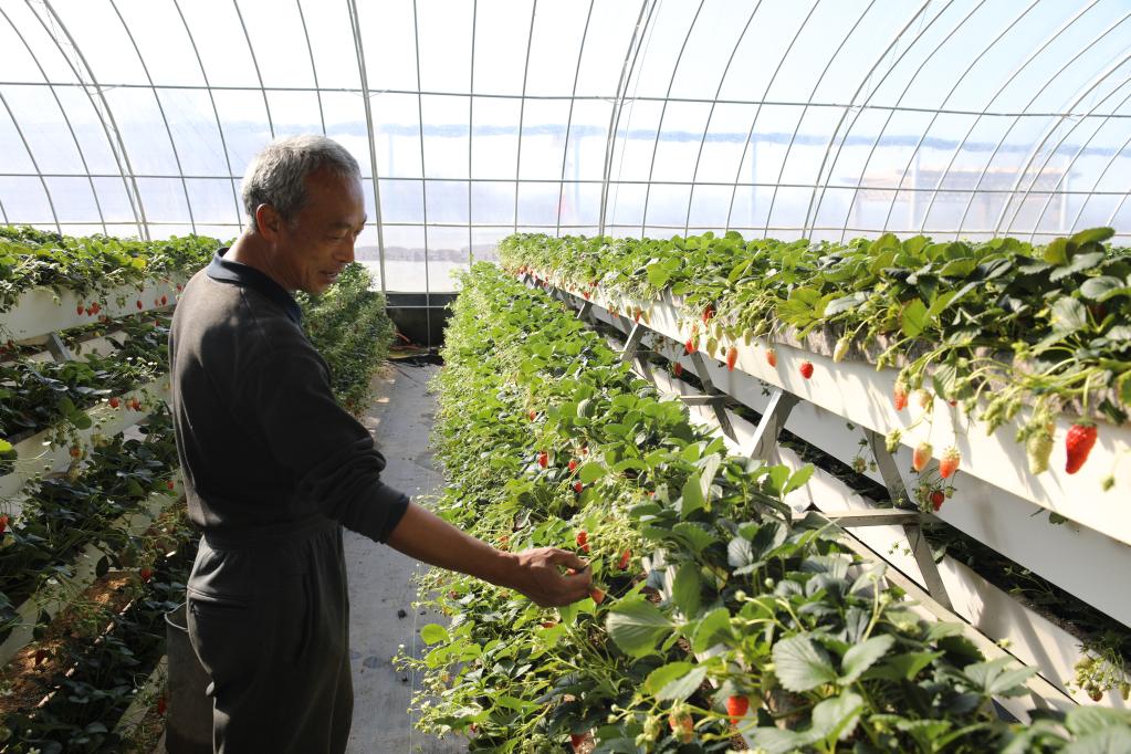 村民在大棚里查看草莓長(cháng)勢。(新華社記者齊雷杰 攝)
