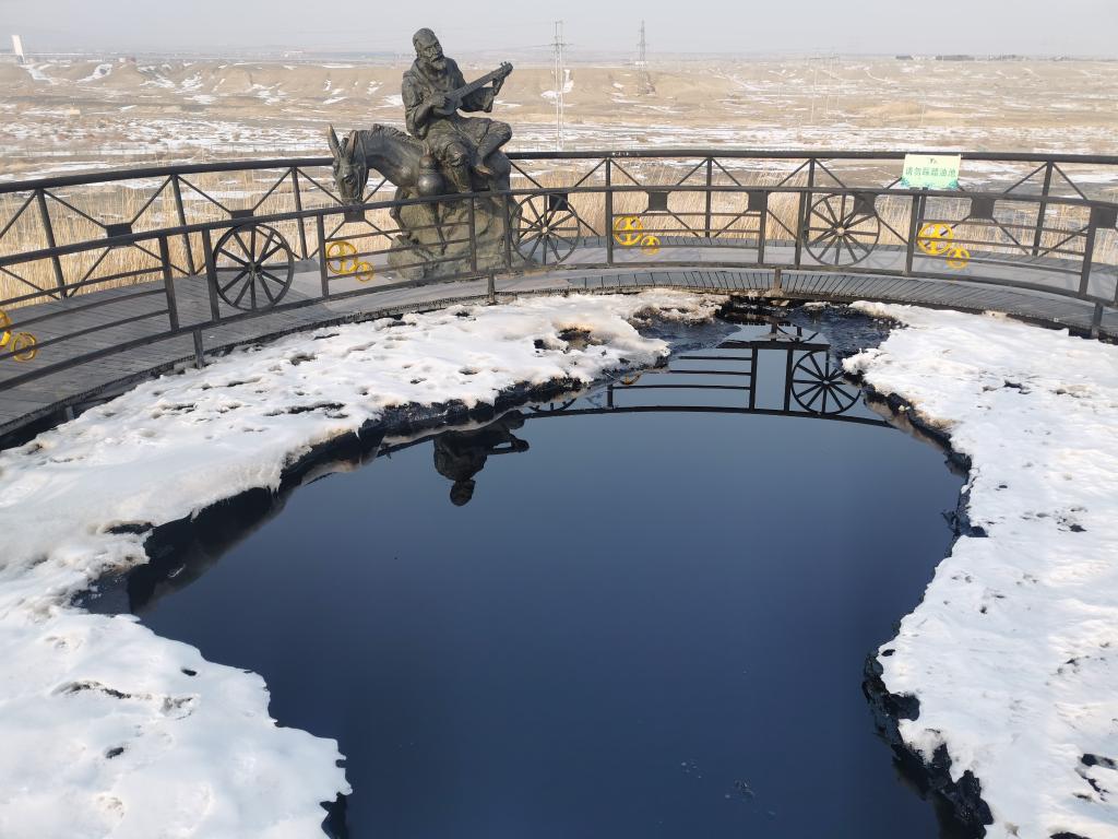 不遠處,石油紀念廣場(chǎng)上,克一號井大油泡雕塑格外亮眼。雕塑下方,正是那口“克一號井”。