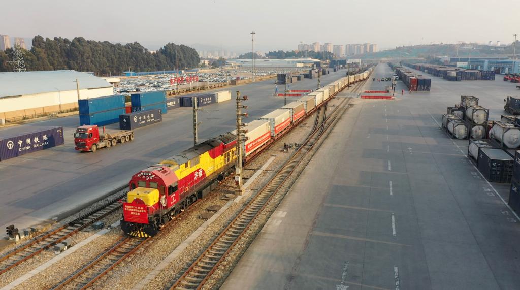 中老鐵路國際貨物列車(chē)從中鐵聯(lián)集昆明中心站駛出。(新華社發(fā))
