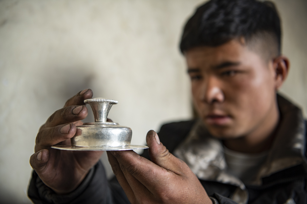 在扎西吉彩金銀銅器加工廠(chǎng)工人正在檢查打制的銀器坯子(3月9日攝)。新華社記者孫非攝
