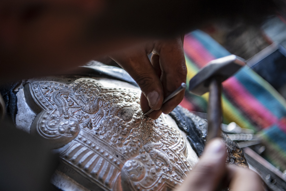 走進(jìn)加工廠(chǎng)車(chē)間,叮叮咚咚的敲擊聲此起彼伏。32歲的巴桑扎西正在制作一個(gè)家用小銀碗,他一手捏緊鋼釘,一手拿著(zhù)小錘不停敲打,“從一塊完整的銀片到打出一個(gè)有精致圖案的碗坯,需要‘捶打’兩到三天才能完成?!彼f(shuō)。