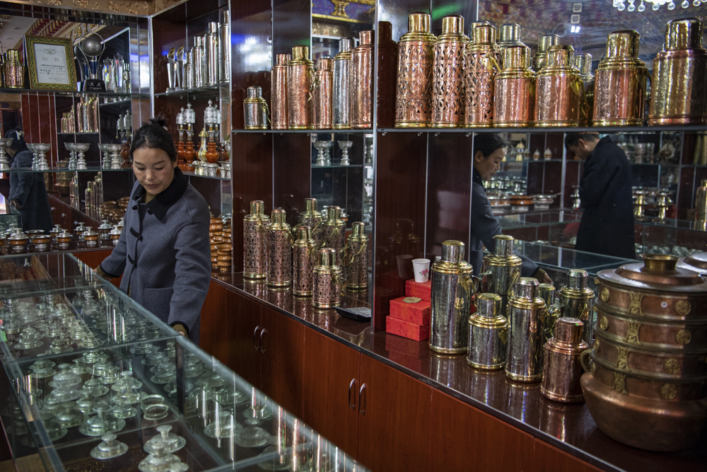 這是扎西吉彩金銀銅器加工廠(chǎng)的產(chǎn)品展示間(3月9日攝)。新華社記者孫非攝