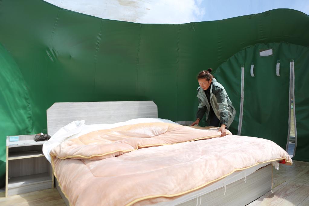 3月24日,白瑪德吉在整理民宿床鋪。新華社記者 邵澤東 攝