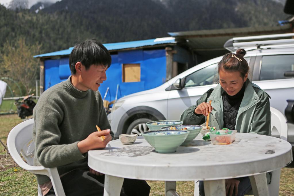 3月24日,白瑪德吉和丈夫殷合在民宿門(mén)前吃飯。 新華社記者 格桑朗杰 攝